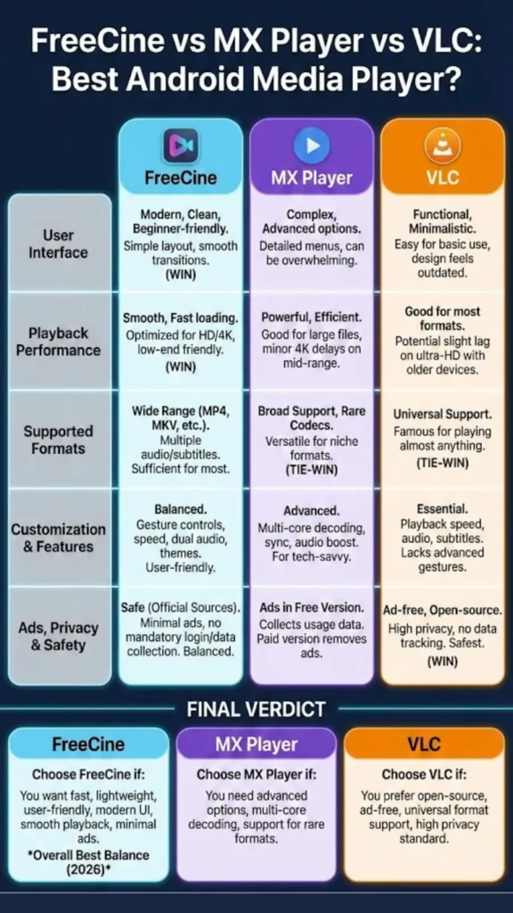 Verdict: VLC leads in privacy, FreeCine offers a good balance of security and minimal ads, and MX Player is safe but may display ads unless upgraded.
